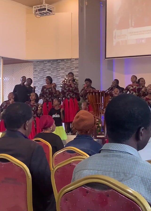 choir performing for an audience in what appears to be a church or auditorium. The choir consists of approximately 20 people, both men and women, dressed in matching outfits with red skirts or pants. They are standing on a slightly elevated platform in front of a projector screen that displays some text and images. One person appears to be directing the choir. The audience is seated in rows of red and gold chairs. They are facing the choir, and some members are visible, including men and women of various ages. The room is brightly lit with ceiling lights, and there are decorations such as flowers and plants. A large fan is visible near a pillar. The chairs are marked with "KHARIS REVIVAL MINISTRIES."