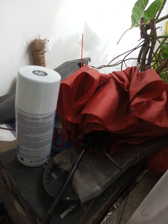 The scene depicts a cluttered arrangement of objects on a dark, indeterminate surface against a white wall, consistent with a utility or storage area within an urban or residential environment in Bhendala, India. No individuals are present. In the foreground, a white aerosol can, approximately 20-25 cm in height, with a black cap and detailed illegible text on its side label, stands upright on the left. To its right, a crumpled, deep red umbrella lies collapsed, displaying its fabric folds and portions of its black metal frame and handle. Behind the aerosol can and leaning against the white wall, a cylindrical object approximately 15 cm long is visible, tightly wrapped in brown natural fibers, possibly coir. Further to the right, a thin, vertical red stick, about 20-25 cm tall, stands against the wall. In the upper right quadrant, a green leafy plant with visible stems and roots extends from the background. The dark surface upon which these items rest appears multi-layered and contains further indistinct objects, including what resembles a clear plastic bag beneath the umbrella and parts of a black object with the word "PROCESSOR" partially visible on it. The white wall exhibits minor imperfections and light staining.