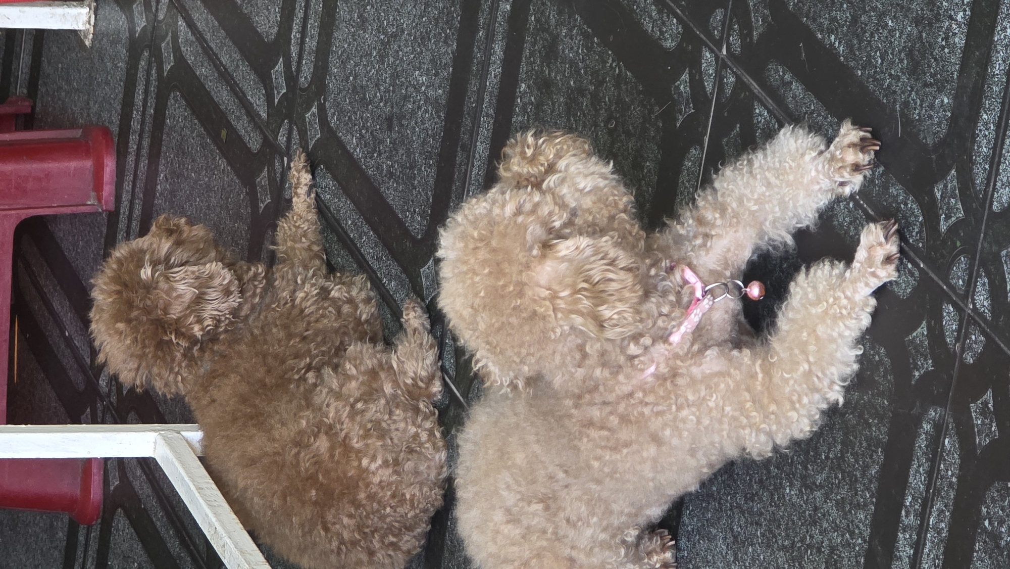 - "Two poodle dogs are lying on a patterned black and gray tile floor, possibly outdoors" by FM-2gAOV2, licensed under CC BY 4.0