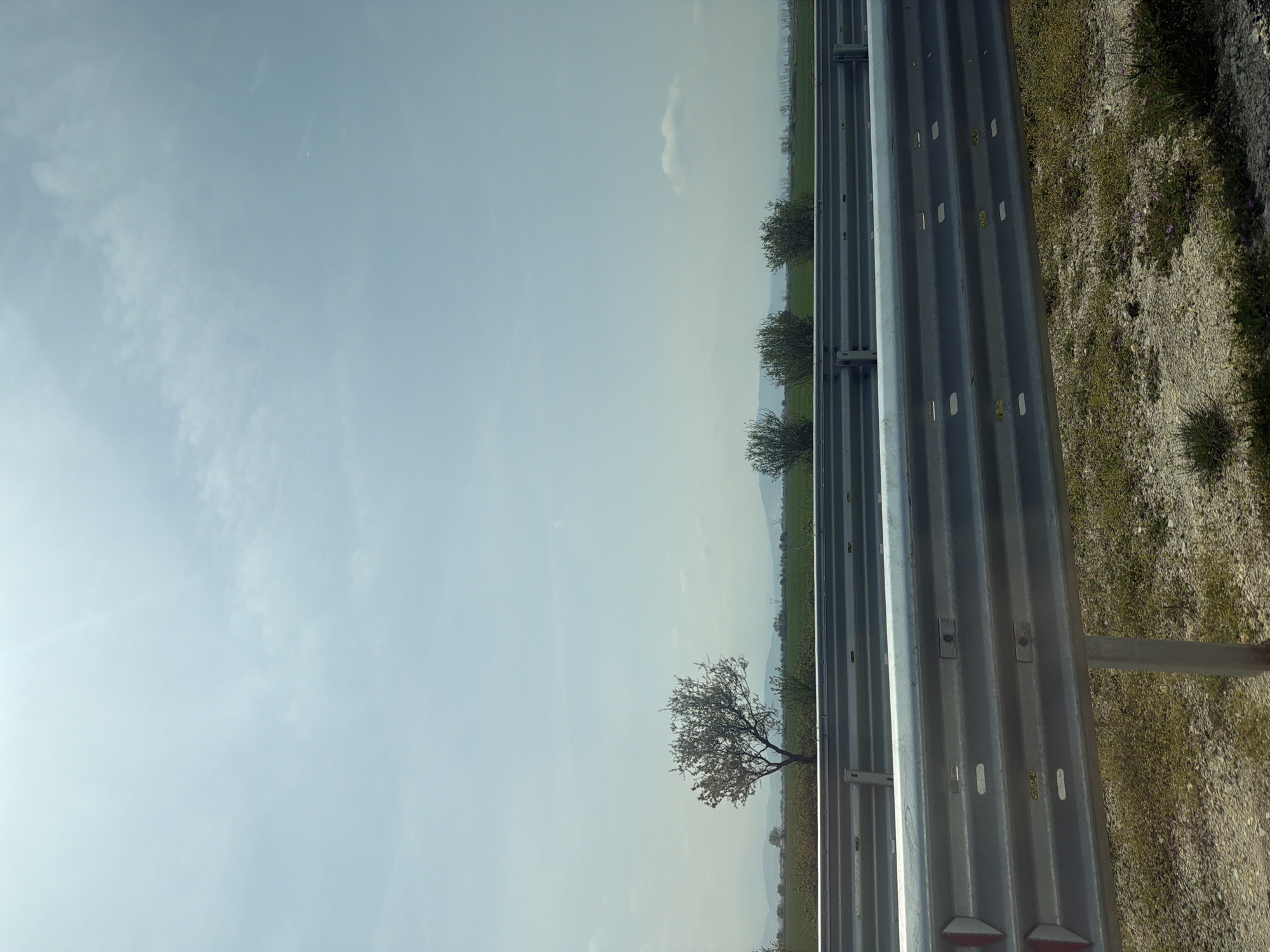 A roadside scene taken in Malo Konare, Bulgaria. A corrugated metal guardrail runs vertically along the right edge of the frame. Adjacent to the guardrail is a narrow strip of dry vegetation and gravel. Beyond the guardrail, an expansive field stretches toward the horizon, punctuated by a sparse line of trees. The sky occupies the majority of the frame, a light blue color with minimal cloud cover. A single tree, larger than the others, is visible in the lower portion of the field. The image has been rotated, so the horizon appears vertical.