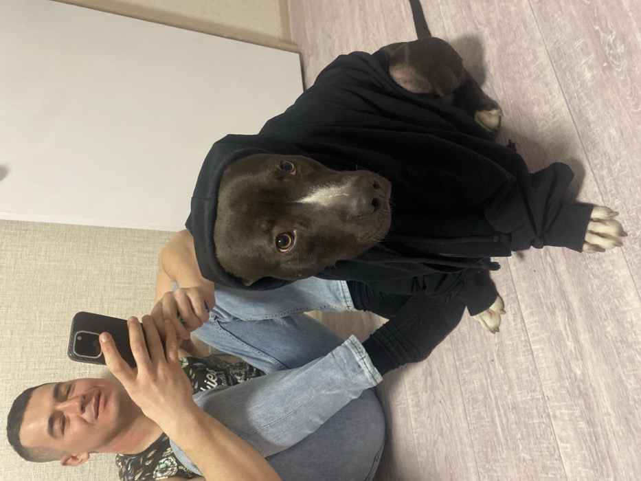 A person is sitting on the floor taking a selfie with their phone. A brown and white pit bull type dog is in a black hoodie and lying across the person's lap. The dog is looking at the camera. The floor is light brown wood grain. The wall is light beige.
