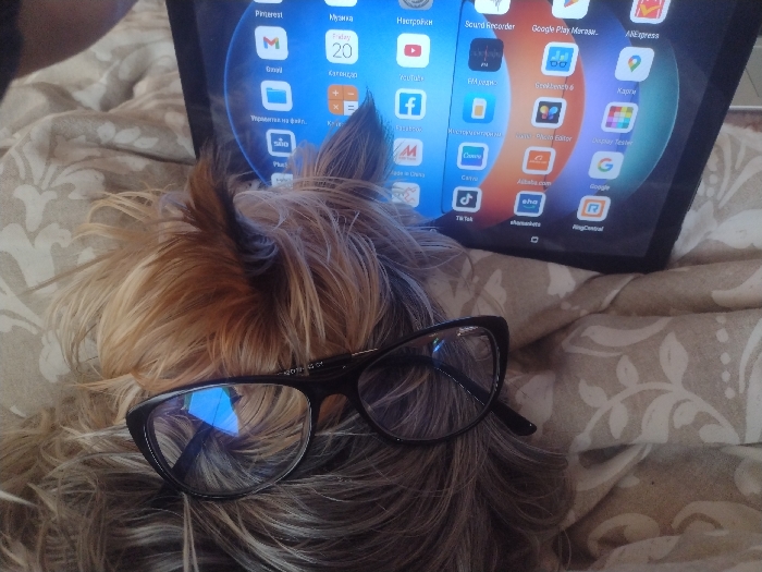 The scene depicts a small, long-haired dog, consistent with a Yorkshire Terrier, lying on a light-colored, patterned bedding material. A pair of black-framed eyeglasses rests on the dog's head, with the lenses reflecting a blue light source. Behind the dog, a black tablet computer is propped vertically, its screen illuminated and displaying a grid of application icons, some with labels in Bulgarian (e.g., "Настройки," "Музика," "Календар" displaying "20") and English (e.g., Pinterest, Google, Facebook, YouTube, AliExpress, TikTok). The environment is an indoor setting, located in Burgas, Bulgaria.