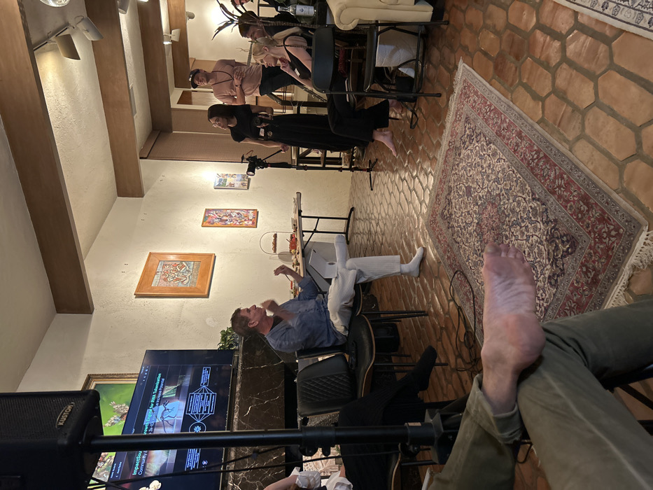 The image depicts an indoor gathering, likely a presentation or discussion, within a residential or event space located in Beverly Hills, United States. The environment features light-colored textured walls adorned with multiple framed artworks, a ceiling with exposed dark wood beams and recessed lighting, and a floor paved with hexagonal terracotta-colored tiles, partially covered by a central oriental rug with red and cream patterns. A large flat-screen television screen displays a presentation slide with text including "ImpactSou... Community & G..." and "Brownfields for RWA Tokenization," situated above a dark-colored mantelpiece. A large black Kustom brand speaker on a stand is positioned in the foreground left. Eight individuals are visible or partially visible. In the foreground left, a bare human foot and lower leg, clad in olive green pants, are partially observed. Centrally positioned, a middle-aged male with short, light-colored hair, wearing a light blue long-sleeved shirt and light-colored pleated pants with white socks, is seated on a black chair. He actively speaks, gesturing with both hands, his left leg crossed over his right. To his right, a refreshment table holds a two-tiered serving tray with snacks and bottled beverages. To the right of the speaker, a female with long dark hair, wearing a black top and long black skirt, stands holding a small object and observing the speaker. She is positioned behind a professional camera mounted on a tripod. Behind her, a male wearing a backwards baseball cap and a light pink t-shirt stands, observing the speaker. Seated nearby is a blonde female in a black top and dark pants, barefoot, looking towards the speaker with a slight smile. At least three other individuals are partially visible in the mid-ground and background right, observing the scene. A white box or binder rests on the floor near the seated speaker. A potted plant is visible in the background right.