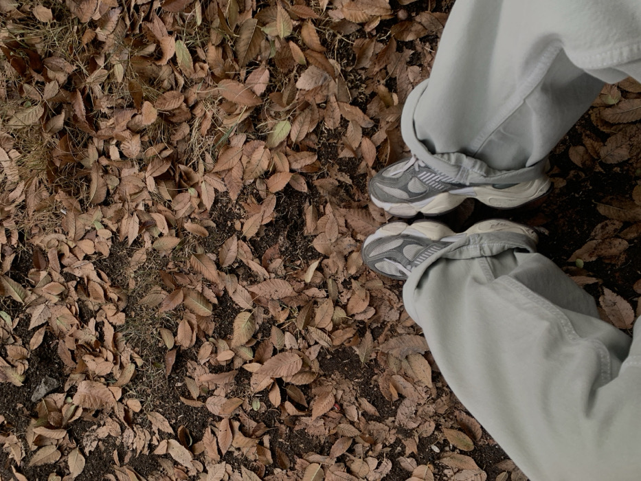 The image displays a downward-facing, first-person perspective of a subject's lower legs and feet, positioned over ground covered extensively with fallen, dry brown and tan deciduous leaves. Patches of dark soil and sparse, dry green-brown grass are visible between the leaves. The subject wears light-colored, possibly light sage green or khaki, loose-fitting trousers with rolled-up cuffs. On the feet are grey and white athletic sneakers featuring textured uppers and thick, multi-layered soles. Both feet are placed flat on the leaf-strewn ground. The scene depicts an outdoor environment, consistent with a park or natural area within the city of Yerevan, Armenia, likely during the autumn season. No other individuals or specific interactions are visible.