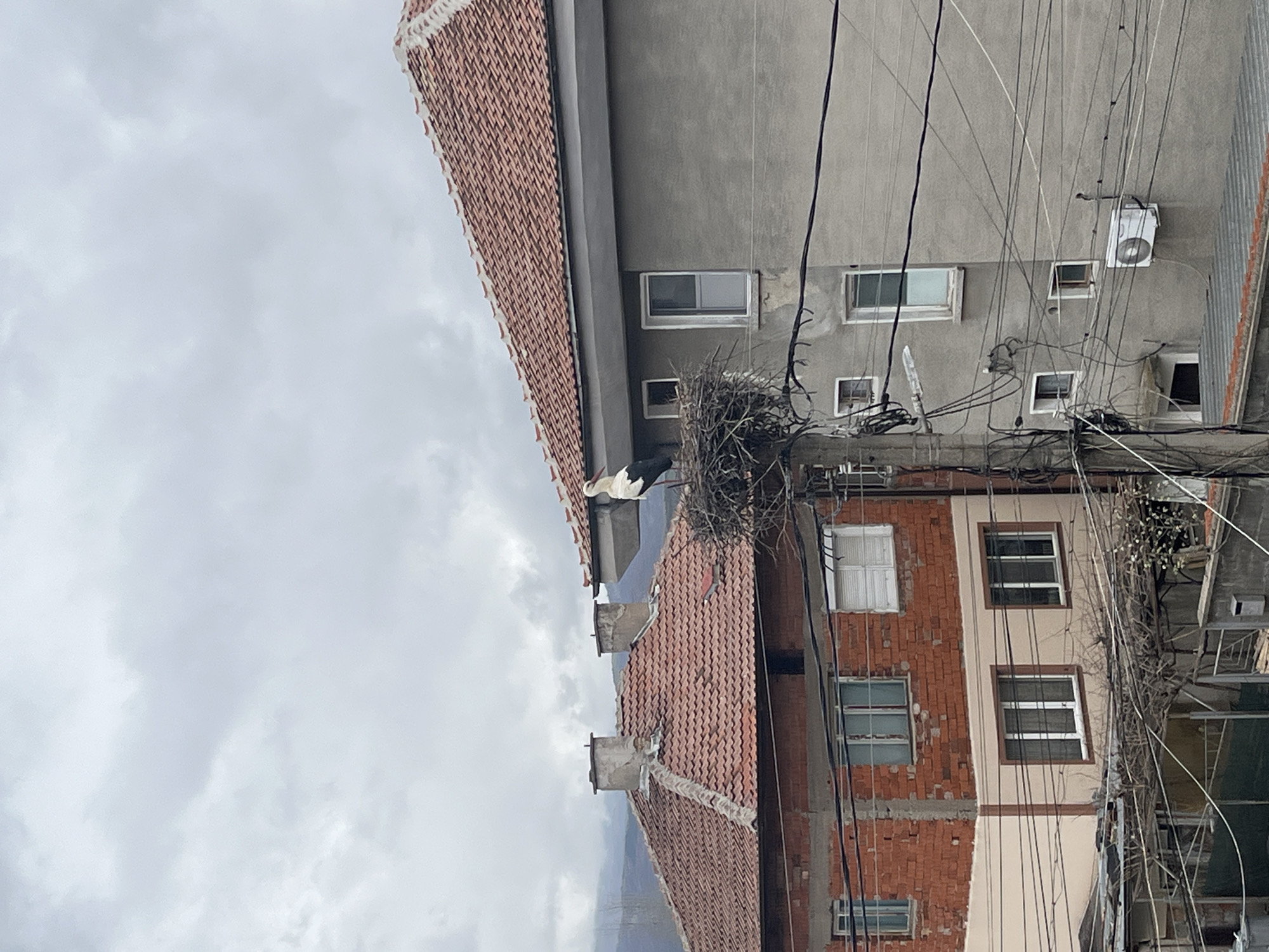 The scene captures a view of buildings in Pokrovnik, Bulgaria, under a cloudy sky. A large bird's nest sits atop a building at the intersection of power lines and architectural elements. The nest appears to be actively inhabited by a white and black bird, which can be seen perched near the edge of the roof. The buildings in the image are a mix of gray concrete and brick construction, with several windows visible. Power lines crisscross the scene, adding to the urban landscape.