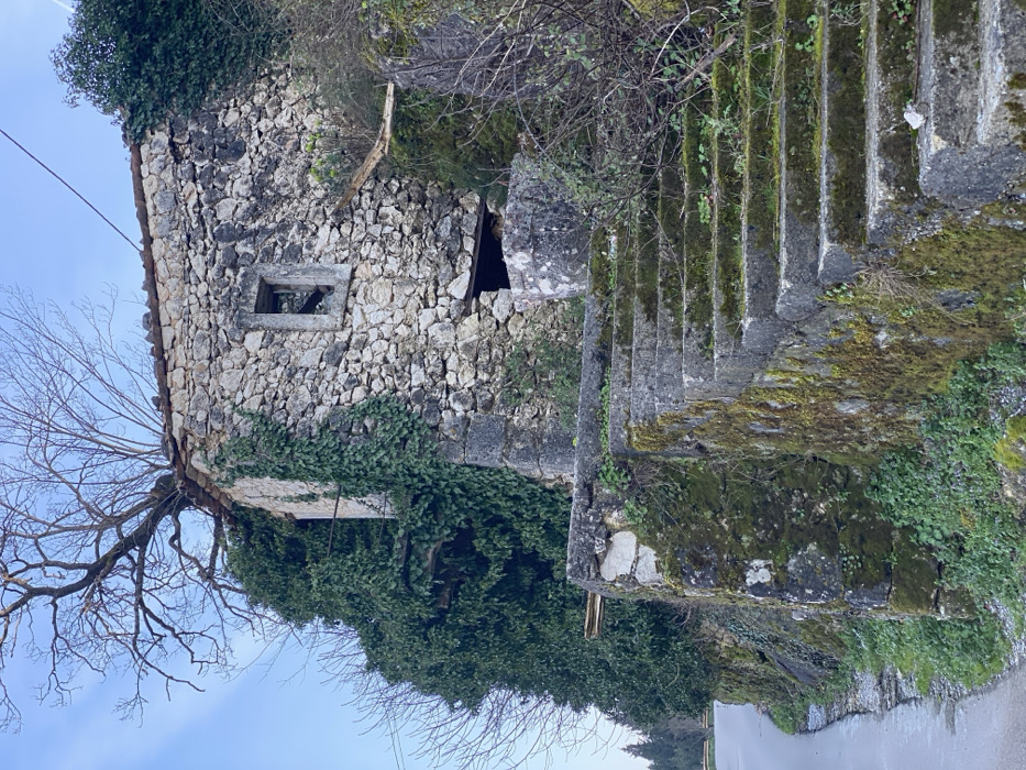 The image depicts a dilapidated stone structure and an adjoining stone staircase in the city of Boljevići, Montenegro