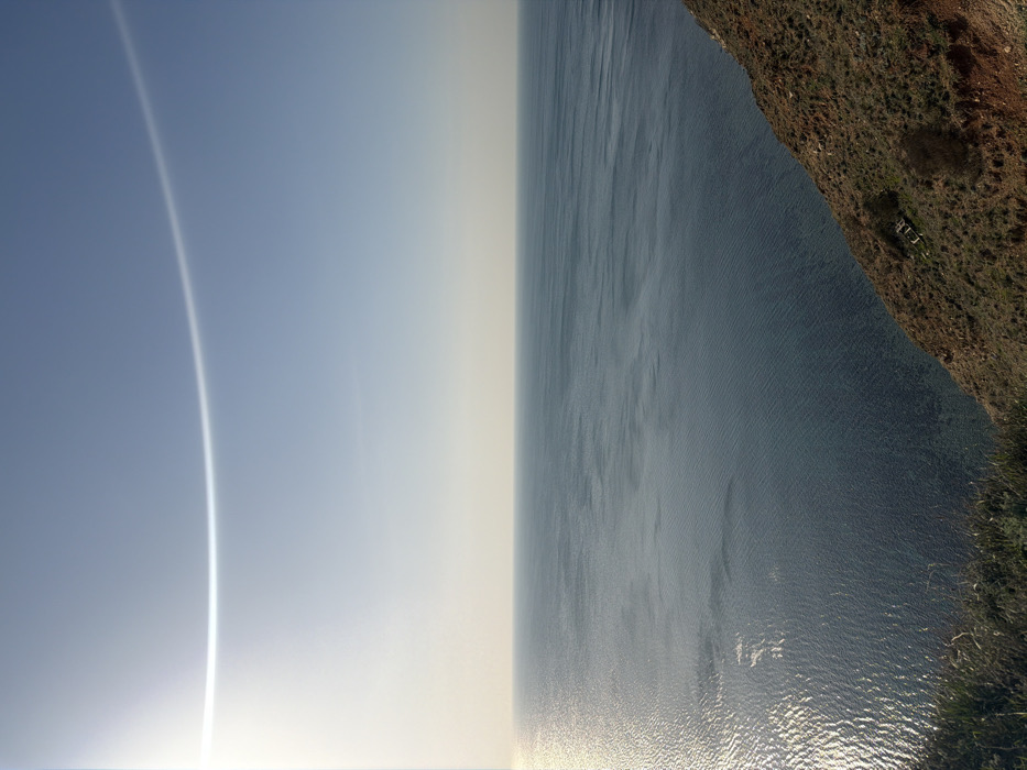 This image presents an elevated, wide-angle view of the Black Sea coastline near Anapa, Russia. The upper half of the frame consists of a clear, light blue sky, transitioning to a paler hue near the horizon. A prominent, curved lens flare is visible in the upper-left quadrant, emanating from an off-frame light source. The mid-ground is dominated by the calm, deep blue-green waters of the sea, exhibiting numerous small surface ripples. Sunlight reflects off the water in the left foreground, creating a bright, shimmering path that extends towards the center. The bottom-right section of the image features a steep, arid coastal slope or cliff, covered with sparse, dry green and brown vegetation, interspersed with exposed reddish-brown earth and rocks. A small, dark shrub is present on this slope. Indistinct, light-colored debris is visible on the lower section of the vegetated incline. No individuals or overt human activity are depicted.