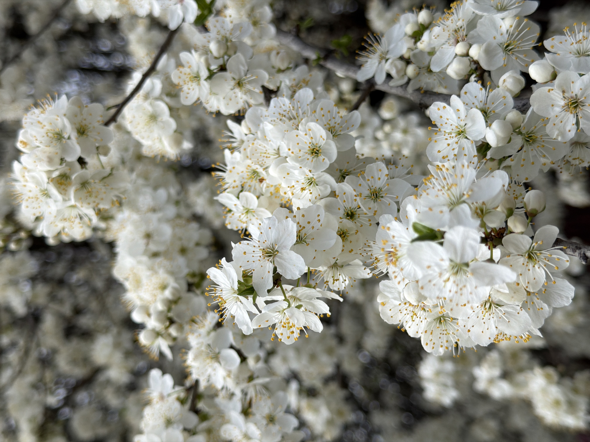 This image shows a close-up of a flowering tree, possibly a plum or cherry tree, laden with white blossoms