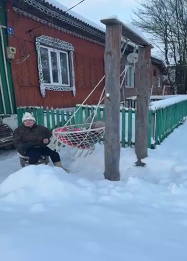 The scene presents a snow-covered area with a wooden structure resembling a swing set. Hanging from the structure is a net swing. A woman, dressed in a jacket and hat, is sitting on a chair near the swing set. The background includes a wooden house with decorative trim and a green fence. The overall environment appears to be a rural setting with a significant amount of snow on the ground. The woman is waving in the general direction of the camera.