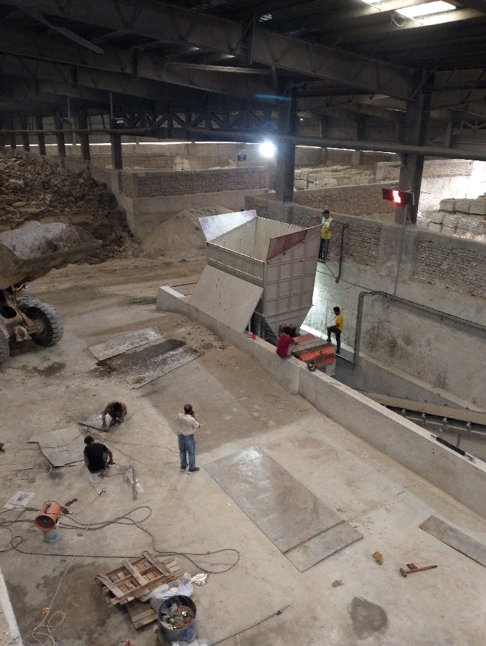 The image depicts a large, industrial building in Pangasia, Bangladesh (latitude: 22.693, longitude: 90.601). The building has a concrete floor and an open, high ceiling with exposed beams. There are multiple large, rectangular openings in the walls, likely doors or gates. The scene features a group of five men working in the building. Two men stand near the center of the floor, one is working with some equipment on the floor while the other is looking towards the right. Two other men stand on a platform to the right, one is looking down at the floor, and the other is facing a large, white container. The container is on a ramp, and there is a small, black metal structure attached to it. There is a large pile of dirt in the lower left-hand corner, and a large, white truck partially visible near the bottom left corner of the image. There are various tools and equipment scattered on the floor, including a metal plate, some cables, a bucket, and a piece of wood. The environment is dusty and cluttered with tools and materials.
