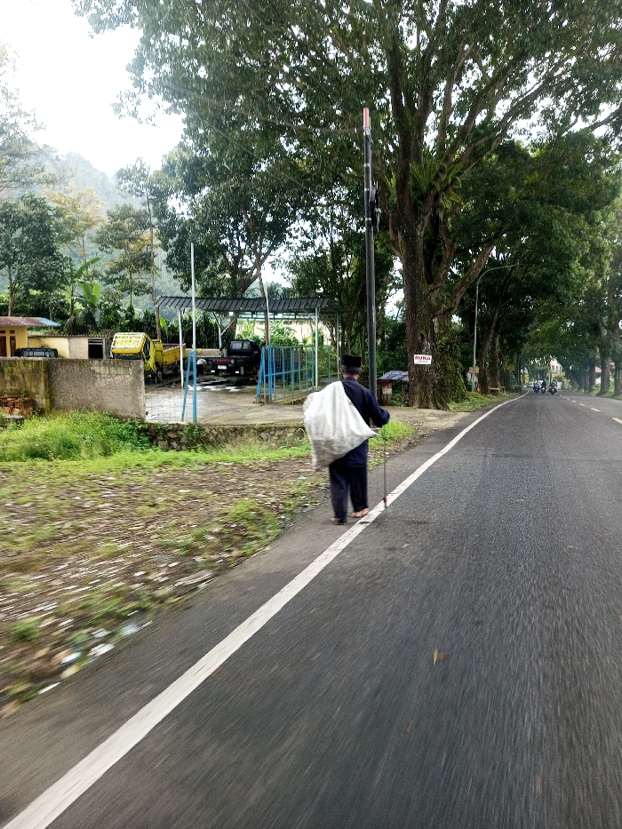 A single individual is observed walking along the shoulder of a two-lane paved road in Kamji Na-Yekha, Bhutan, under an overcast sky. The person, seen from behind, wears dark clothing and a dark cap, carrying a large white sack over their left shoulder and using a walking stick in their right hand. The road surface is dark grey and appears damp, with a solid white line marking its edge. To the immediate left of the road is an unpaved shoulder transitioning to a low concrete wall, beyond which sits a building complex with a covered bay. Within this complex, a yellow dump truck and a dark pickup truck are visible. Lush green hills and dense foliage form the background. To the right of the road, a row of large trees with dark green canopies lines the thoroughfare. A tall black utility pole with a red-tipped antenna stands between the pedestrian and the trees. Further down the road, several vehicles, possibly motorcycles, are visible in the distance. A small white sign with red text is affixed to one of the tree trunks.