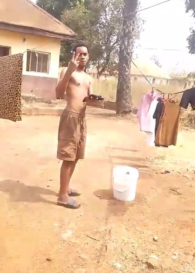 A person, shirtless and wearing shorts and sandals, is holding what appears to be a dark-colored handgun in their right hand. They are standing in a yard with a small house in the background. There is a bucket on the ground near them. Clothes are hanging on a clothesline. The ground is dirt. The person appears to be demonstrating or mimicking gun handling.