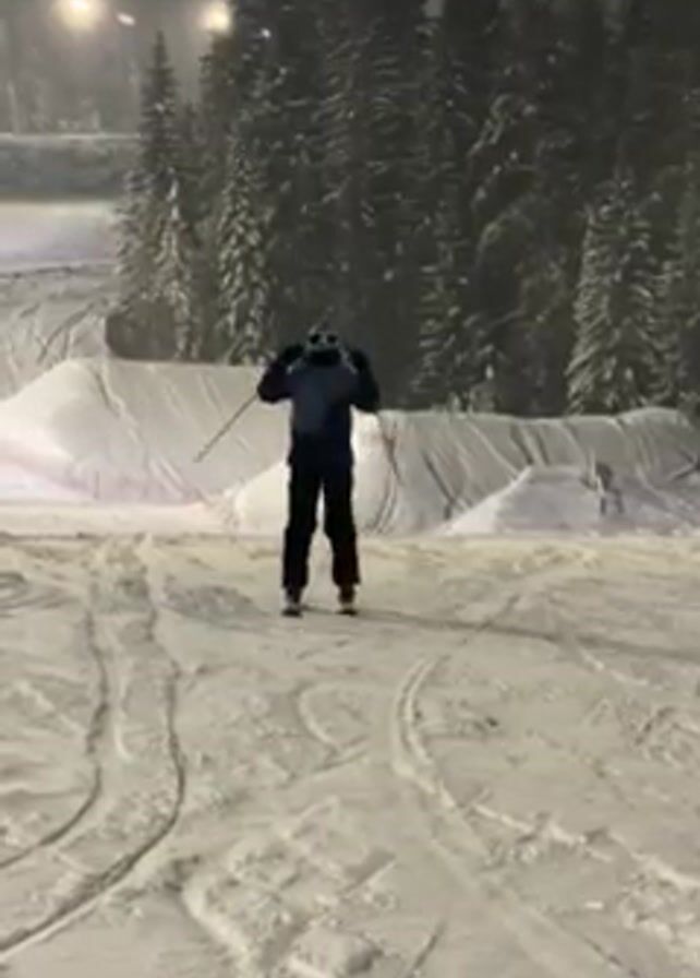 A person wearing a gray beanie, mirrored goggles, a black face covering, a bluish-gray jacket, and black pants is standing on a snow-covered slope with skis on their feet. They appear to be adjusting their clothing or equipment before starting to ski down the hill. The slope is illuminated by artificial lights, and there are visible tracks in the snow. In the background, there are snow-covered mounds and evergreen trees. The scene suggests a ski resort at night.