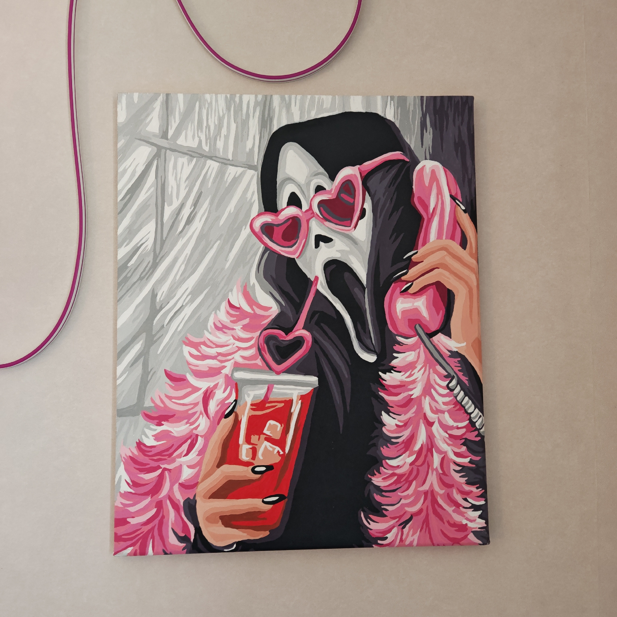 painting hanging on a light beige wall. The painting depicts the character Ghostface from the "Scream" franchise, but with a humorous and stylish twist. Ghostface is wearing pink heart-shaped sunglasses and a pink feather boa, holding a pink retro-style telephone to their ear in one hand and a drink with ice and a heart-shaped straw in the other. The background of the painting features gray and white angular lines, potentially representing a window or abstract pattern. A pink cord runs along the wall beside and above the painting. No information about Rostov, Russia is presented.