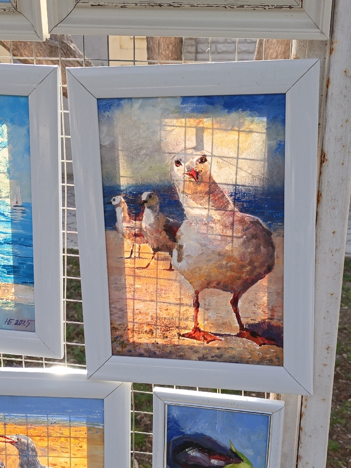 An outdoor art exhibition stand in Yevpatoriya, Ukraine, displays several framed paintings, with a central oil painting of three seagulls prominently featured