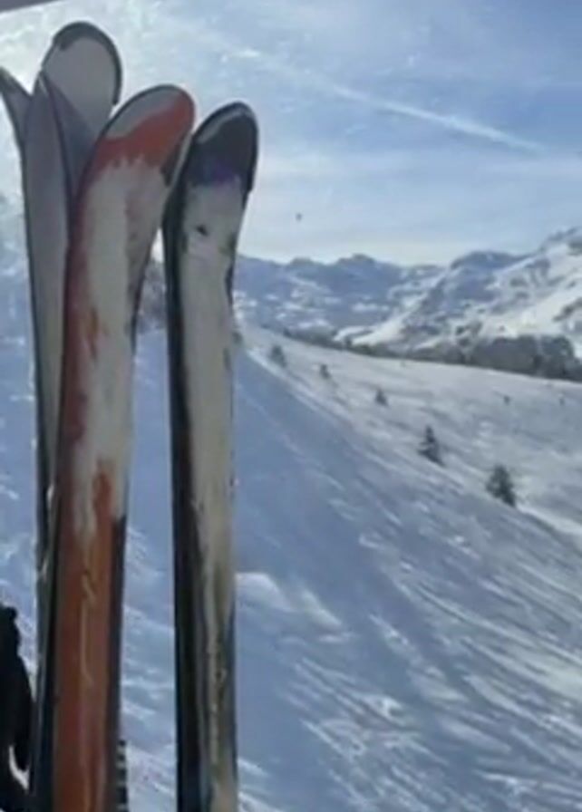 view from inside what appears to be a ski lift or gondola. Three pairs of skis are visible, held in a rack inside the lift. The skis are different brands and colors, covered with some snow. Outside, there's a snowy mountain landscape under a blue sky with wispy clouds. The slopes are visible, with some scattered trees. A hand is visible, briefly touching the skis. Light flares from the sun are visible on the window.