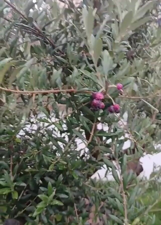 The camera pans across a small olive tree with ripening purple olives in a garden on a gray day
