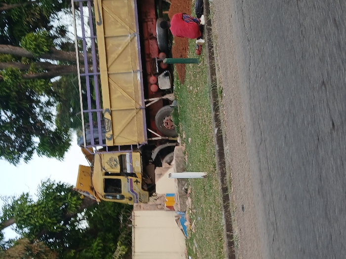 - "In Jos, Nigeria, a heavily damaged yellow and red flatbed truck is positioned off a dark asphalt road" by FM-ueEo62, licensed under CC BY 4.0