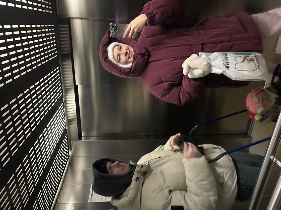 Inside an elevator, two people bundled in winter attire pose. A woman in a burgundy puffer coat and fuzzy white gloves smiles, holding a branded shopping bag. Below, a man in a tan puffer jacket with a dark hood adjusts something with his hands. The elevator's interior features perforated metal walls and a mirrored stainless steel back. A garment rack with a stuffed animal hangs behind the man. The photo is taken at an angle.
