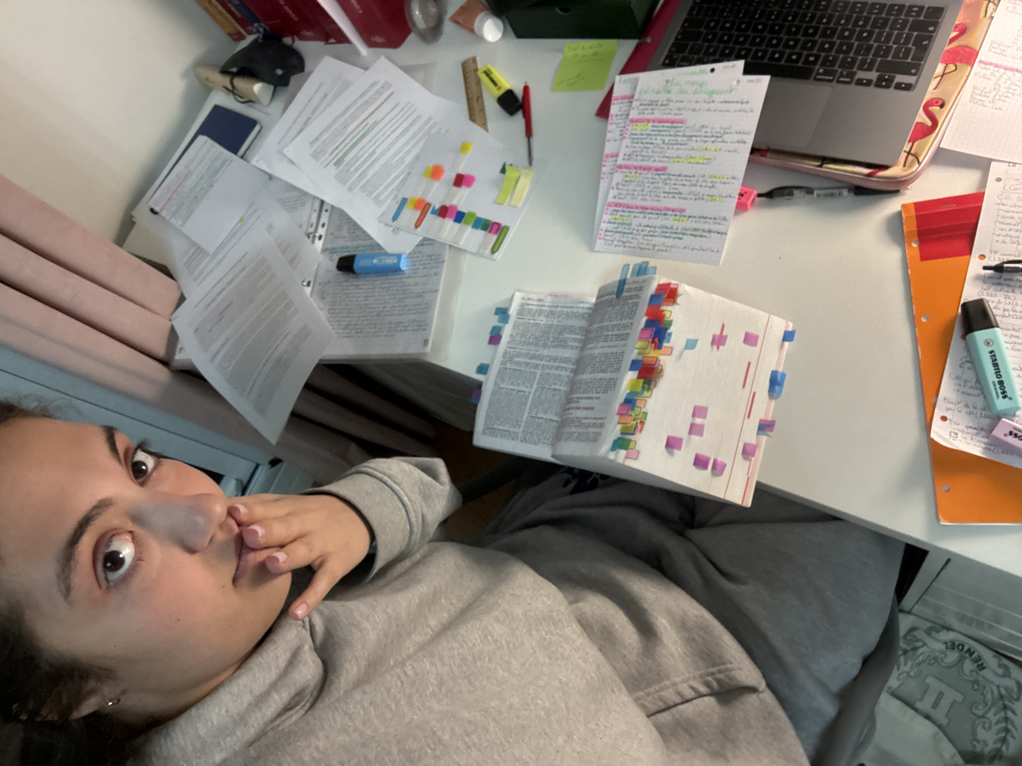 The image depicts a young adult female seated at a cluttered desk within what appears to be a residential room in Neuilly-sur-Seine, France. The female subject occupies the left side of the frame, looking directly towards the camera with a wide-eyed expression. She has dark hair, a light-to-medium complexion, and a small silver stud earring in her left ear. She wears a grey hooded sweatshirt (hoodie) and matching grey sweatpants. Her right hand is raised, with fingers lightly touching her chin and lower lip; her fingernails have a light pink polish. The desk surface, primarily white, is extensively covered with numerous study materials. These include multiple stacks of printed papers or open books, many heavily marked with colorful sticky notes/flags in shades of pink, blue, green, yellow, and orange along their edges. Several loose sheets of paper, some with handwritten notes and highlighting in various colors, are scattered across the desk. Specific objects on the desk include: * Multiple highlighters (one light blue, one yellow, both appearing to be Stabilo Boss brand). * A red pen or marker. * A small wooden or brown ruler. * An open notebook or binder with extensive handwritten notes, highlighted in pink and yellow. * A silver-colored laptop, possibly a MacBook, resting on a base adorned with a pink flamingo pattern, visible on the right side of the desk. * A dark green binder or folder. * Several red-spined books or binders stacked vertically on the far right. * A dark blue folder or binder. * A small, clear cylindrical container and other small objects, possibly cosmetics or stationery. * An orange folder is visible at the bottom of the frame, alongside more papers and another light blue highlighter and a black pen. In the background, behind the subject and the desk, light-colored walls are visible. Pink or peach-colored curtains partially obscure a window area along the top left of the frame. The overall lighting suggests an indoor setting, possibly with a mix of natural and artificial light.