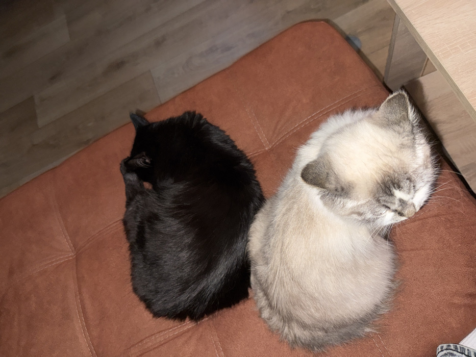 The image depicts an indoor scene in Rostov-on-Don, Russia, showing two domestic cats resting. A black cat is curled into a tight spherical shape in the upper portion of the frame, positioned on a reddish-brown upholstered surface. Below and to the left of the black cat, a second cat, exhibiting cream-colored fur with darker points on its face and ears, is also curled up, appearing to be asleep with its eyes closed. Both animals are situated on the padded, reddish-brown fabric, which features distinct stitching patterns. To the right of the upholstered surface, a light-toned wooden plank floor is visible, extending towards the upper right. A lighter wooden or laminate surface is also partially visible in the lower right corner of the frame, adjacent to the upholstered item.