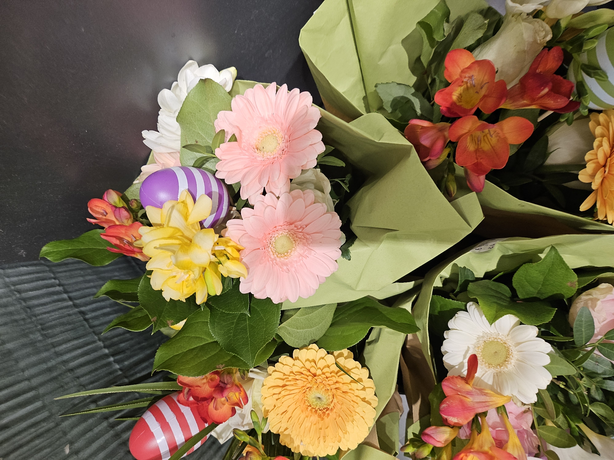 This close-up, overhead image displays a collection of floral bouquets, presented as if for sale or display. Visual elements within the image do not provide specific geographical indicators to confirm the requested location in Trier, Germany. The scene features multiple arrangements composed of various flowers, including prominent pink, yellow, and white gerbera daisies, interspersed with orange, red, and yellow freesias, and abundant green foliage. Two striped plastic Easter eggs are visible: one red with white horizontal stripes is partially embedded in the upper-left bouquet, and one purple with white horizontal stripes is positioned in the upper-center bouquet. Each bouquet is partially wrapped in light green paper. The background consists of a dark, vertically ribbed or textured surface, likely a wall or display panel. The presence of Easter eggs indicates a seasonal context, specifically around the Easter holiday.