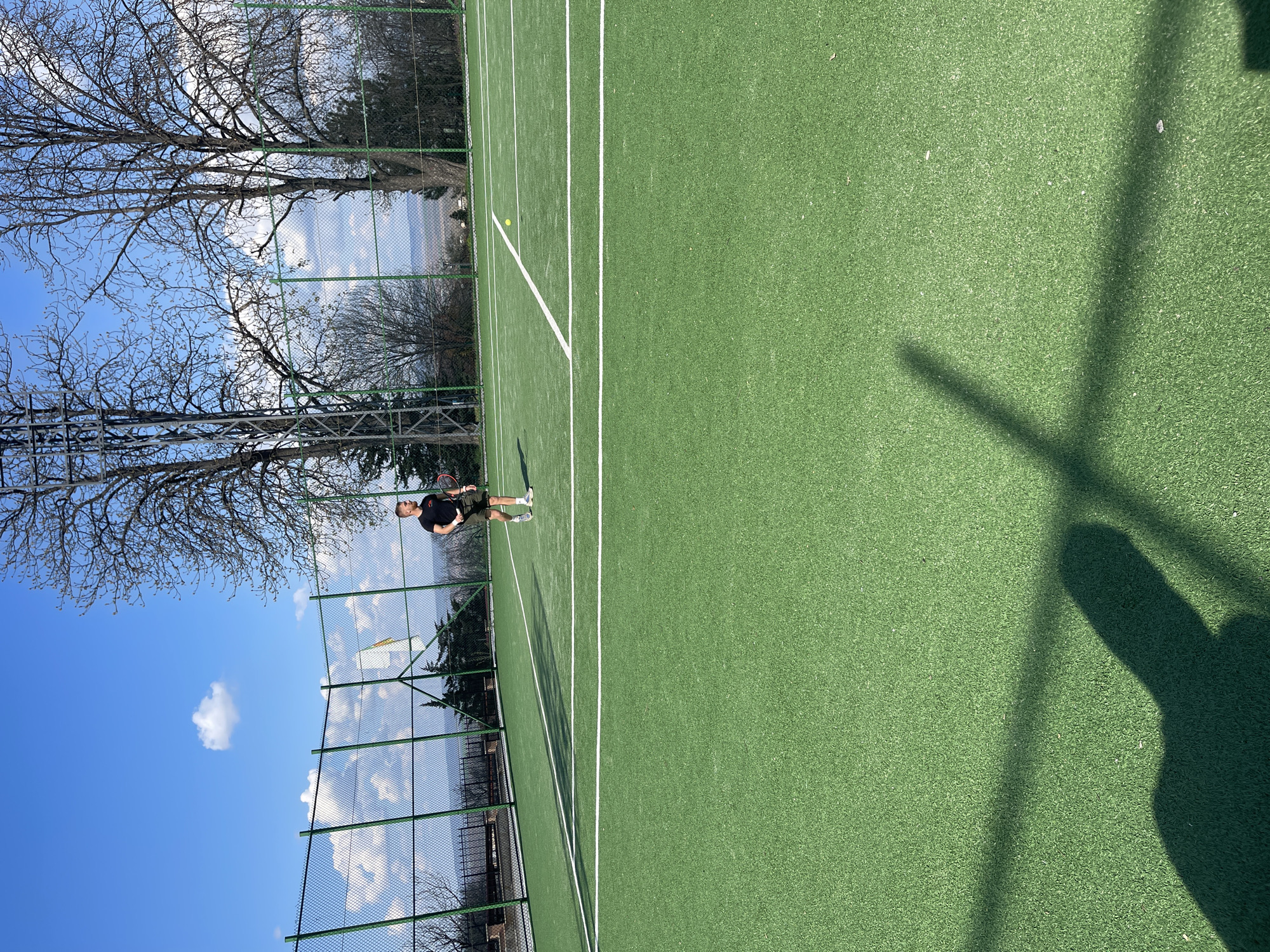 A photograph taken outdoors depicts a tennis court in Lyaskovets, Bulgaria, during daylight hours. The court is green with white lines marking the boundaries. A man stands on the court near the left side, holding a tennis racket. A tennis ball is visible on the court near the left sideline. A tall metal fence surrounds the court. Bare trees and other vegetation are visible beyond the fence. The sky is blue with some clouds. The shadow of an object, possibly a person or a pole, is cast on the right side of the court.