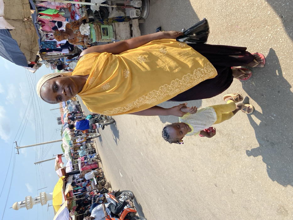 The image depicts an outdoor street scene within a market environment in Lokoja, Nigeria, under a bright, sunny sky with scattered clouds. In the foreground, a woman and a young child walk from right to left across a paved road. The woman, positioned closer to the camera, wears a light yellow headscarf and a sleeveless, vibrant yellow wrap with embroidered patterns over dark trousers, complemented by red flip-flops. She has distinct facial scarification marks on her right cheek and forehead and looks directly forward. In her left hand, she holds a black plastic bag. A young child, appearing to be a girl, holds the woman's right hand. The child wears a white and yellow striped short-sleeved top, yellow leggings, and tan sandals. Her hair is styled in small braids adorned with colorful beads. The child looks slightly downwards and to her left. The background is a bustling market. To the immediate right of the woman is a market stall with a striped blue and white awning, displaying various clothing items including bras and tops. Another woman is partially visible behind the counter of this stall. Across the street, numerous other market stalls with colorful awnings (yellow, red, blue, green) line both sides of the road, featuring diverse merchandise. Several individuals, primarily men, are visible walking or riding motorcycles (okadas) on the street. An orange motorcycle with a rider is prominent on the left side of the frame. Overhead, utility poles and power lines are visible. In the distant left background, a white mosque minaret with a green dome stands prominently. The bright sunlight casts sharp shadows of the woman and child onto the road surface.
