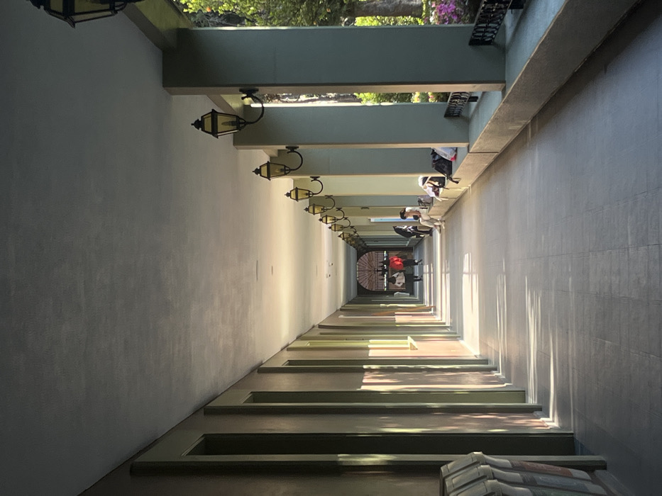 - "The image displays a long, covered pedestrian walkway with light gray tiled flooring, receding into the background towards a decorative arched entrance featuring visible ironwork" by FM-Y1BL73, licensed under CC BY 4.0