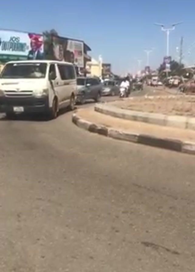 street scene in what appears to be a city in Africa. The weather is sunny and the sky is clear. There are several vehicles on the road, including a white Toyota Hiace van, a silver sedan, and several motorcycle taxis. The van has a sign on the side that reads "Luxury Sunshine". There are also several people walking on the sidewalk. There are some buildings and billboards visible in the background. One billboard shows a politician with the slogan "JOS OUTPOURING". The camera is stationary and the video appears to be shot from a low angle.