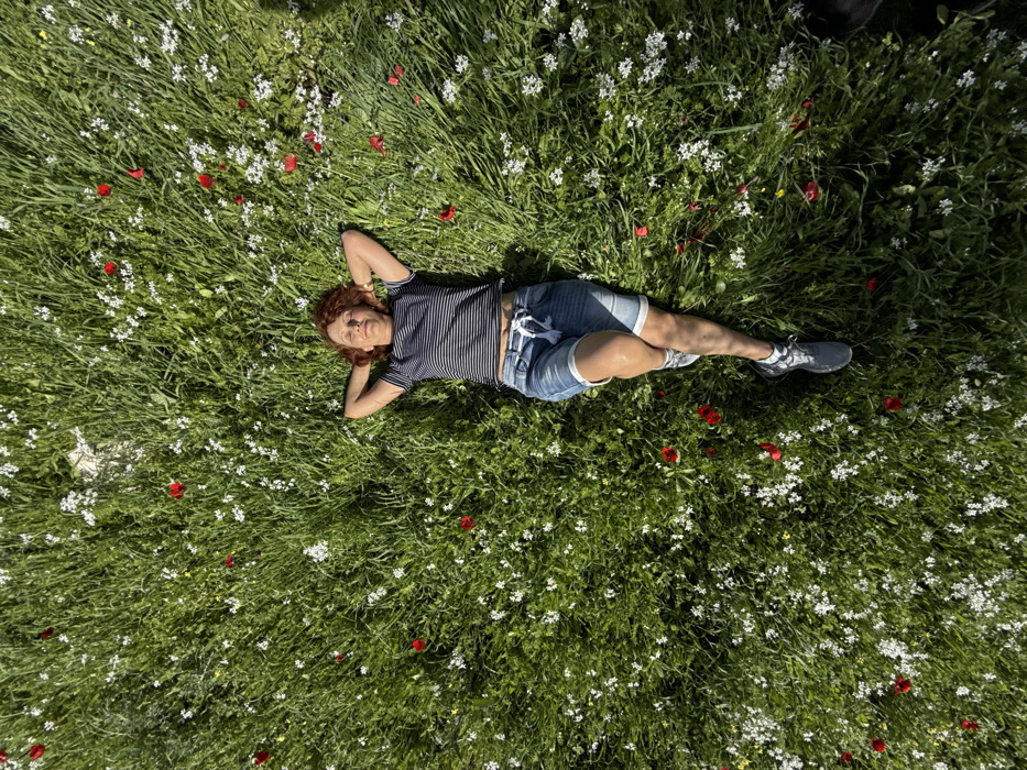 - "An overhead, high-angle photograph depicts an adult female lying supine in a field of vibrant green grass, interspersed with numerous small white wildflowers and scattered red poppy petals" by FM-XR4443, licensed under CC BY 4.0