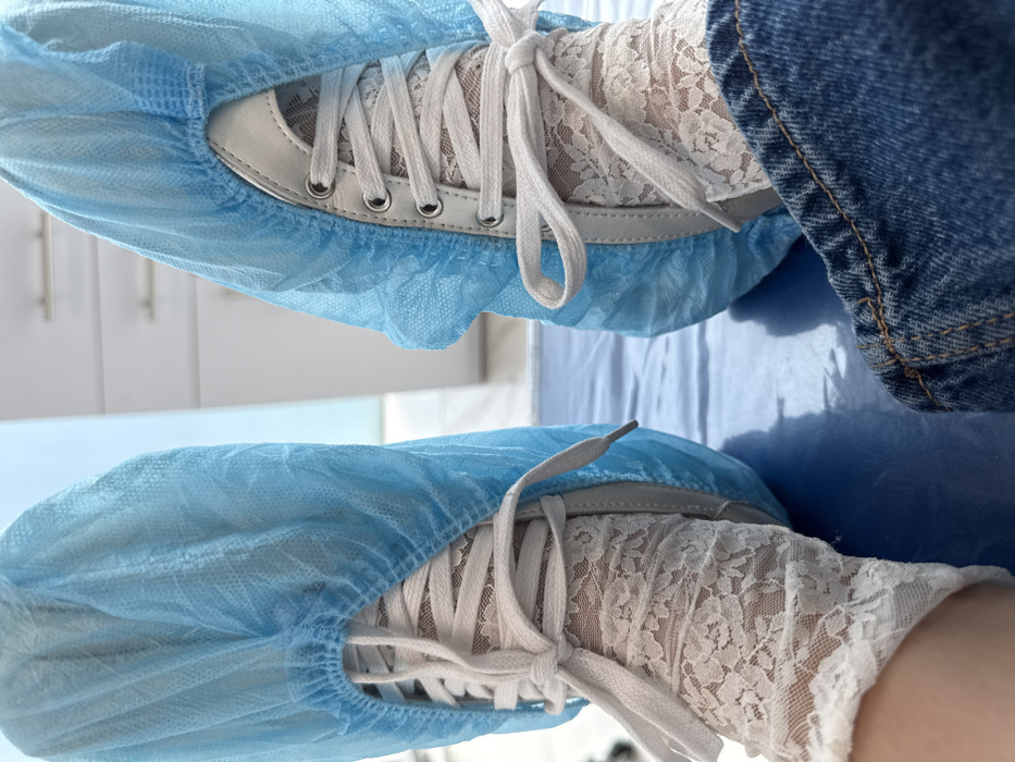 The image displays a person's lower legs and feet in a clinical setting, located in Mexico City, Mexico. Both feet are wearing white sneakers with white laces, over which white lace socks are visible, and are covered by light blue disposable shoe covers. The right leg is partially clothed in blue denim jeans. The feet rest on a flat, blue, reflective surface. The background features white medical-style cabinetry with metallic horizontal handles and a light blue wall, consistent with a sterile or clinical facility.