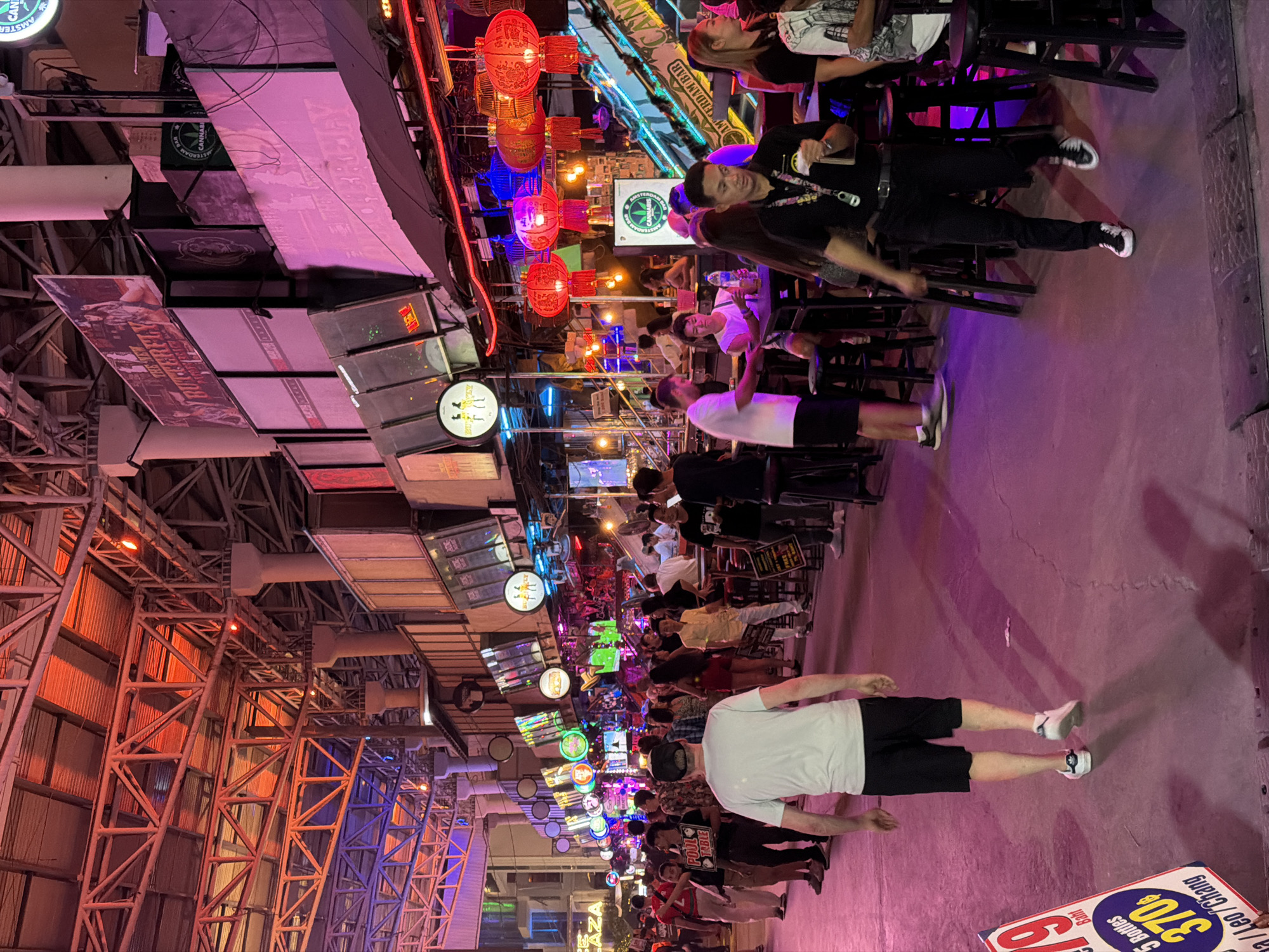 This image depicts a bustling open-air entertainment street at night in Patong, Thailand, specifically appearing to be Bangla Road or a similar venue. An intricate metal truss roof structure, illuminated with red and purple lights, covers the entire street. The street is lined on both sides with multiple open-fronted bars and establishments featuring extensive neon and LED signage, large display screens, and decorative hanging lanterns, predominantly red and blue. Visible signs include "The New Butterfly," "Amsterdam Bar," and multiple "Cannabis" leaf logos. The paved walkway below exhibits a strong purple hue from the ambient lighting. Numerous individuals, appearing to be adults of varying ages, populate the street. Many are walking, while others are seated at high-top tables on bar stools, engaged in drinking and conversation. In the central foreground, a man wearing a white t-shirt, black shorts, and white sneakers walks away from the camera. In the mid-ground, to the right, another man in a black polo shirt, black trousers, and black-and-white sneakers, wearing a lanyard with an ID badge, holds a mobile phone as he walks past seated patrons. Several individuals are seated at tables in the mid-ground and background, consuming beverages from bottles and glasses. A white and red promotional sign is visible in the lower-left foreground, partially obscuring the view, advertising "5 Bottles 370 Baht Leo/Chang." Another person in the background holds a black sign promoting a "Pool Table." The overall environment is brightly illuminated by the diverse array of artificial lights, creating a dynamic nightlife atmosphere.