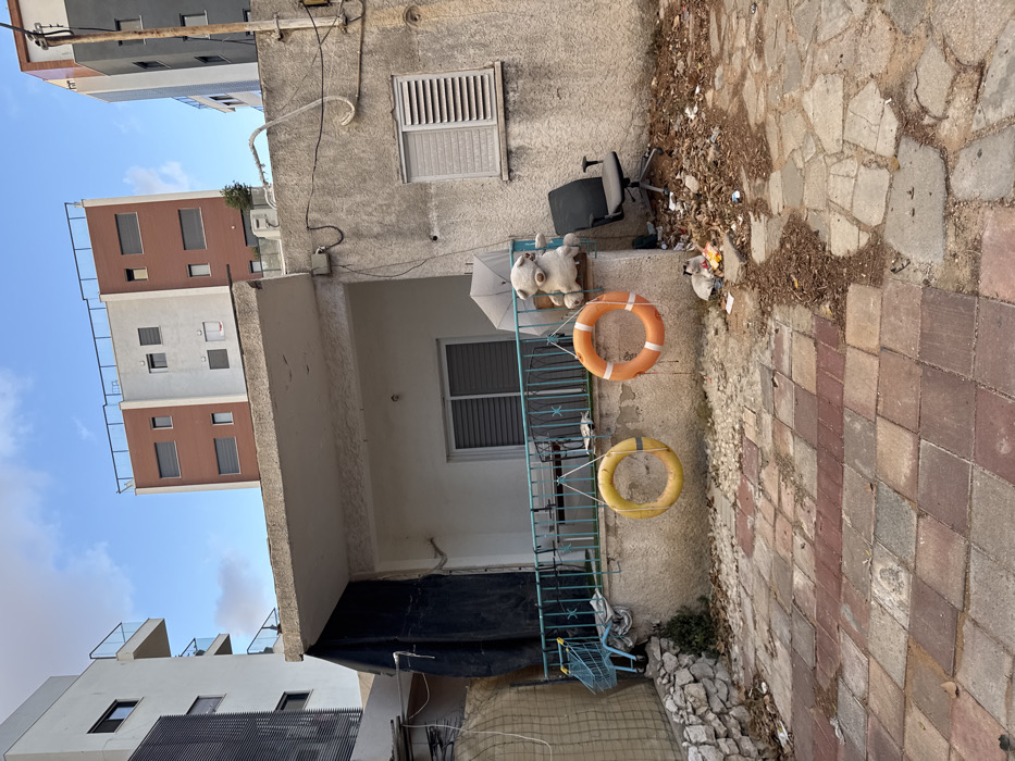 The image depicts an outdoor urban scene in Ramat Gan, Israel, featuring a ground-level area bordered by a low-rise building and newer multi-story residential structures under a partly cloudy blue sky. The foreground presents a partially paved surface composed of square pavers in varying shades of terracotta and grey, intermixed with areas of loose dirt, small stones, and organic debris. A small, light-colored cat is observed resting on a pile of debris, alongside a discarded colorful object, on the right side of the paved area. To the left, a low stone wall supports a mesh barrier. The midground is dominated by the lower section of a building featuring a concrete balcony with a light blue metal railing. Two lifebuoy-style rings, one yellow and one orange with white stripes, hang from this railing. A large, light-colored teddy bear sits on the concrete ledge of the balcony on the right. An open, light grey umbrella leans against the wall near the teddy bear. Behind the railing, an interior space with a window (closed horizontal blinds) and outdoor furniture is partially visible. To the left of the balcony, a blue metal shopping cart, covered by dark fabric, rests against a wall. The exterior wall of the building, to the right of the balcony, has a window with horizontal shutters, and utility wiring runs along its surface. An office chair with wheels is lying on its side amidst a collection of dirt and refuse beneath this window. The background displays multiple modern, multi-story residential buildings. These include a white building with dark windows and glass-paneled balconies to the left, and a prominent two-toned (brown and off-white) building with dark windows and rooftop railings in the center-right. Sparse vegetation and rooftop mechanical units are visible on these structures.