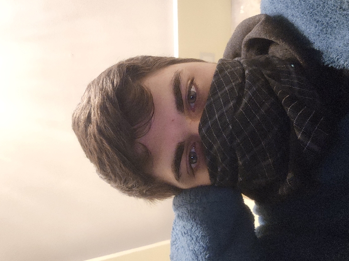 A frontal, close-up image depicts a single individual, likely male, indoors. The subject has short brown hair and blue-grey eyes, which are directly focused on the camera. The lower half of the face, including the nose and mouth, is obscured by a dark-colored fabric covering, possibly a scarf, featuring a distinct grid pattern of thin white lines. The individual is wearing a light blue, textured garment, possibly fleece, covering the left shoulder and partially visible left arm. A darker garment is visible beneath the blue fabric on the right side of the frame. The background consists of a plain, light-colored wall or ceiling surface, indicating an indeterminate indoor environment. No specific location within the city of Unknown, Unknown can be identified.
