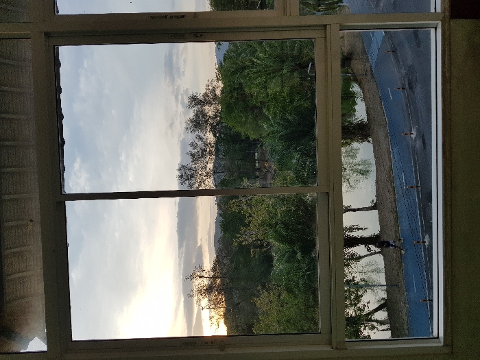 The image displays an outdoor scene observed through a multi-pane white window frame, indicating an elevated viewpoint within Phuket City Municipality, Thailand. The time is either sunrise or sunset, characterized by a bright, low sun on the left horizon casting diffused light under a sky with scattered grey and white clouds. In the mid-ground, a calm body of water, likely a pond or lake, reflects the surrounding trees. Adjacent to the water is a paved path or road. This path features a distinct blue section on the left, possibly a dedicated lane, marked with dashed white lines. The right portion of the path is grey asphalt, along which several black bollards with orange tops are regularly spaced. One individual, dressed in dark clothing, is present on the blue section of the path, positioned near the water's edge. The person appears to be walking or moving along the path. The background consists of dense, lush green foliage and trees covering distant hills. The overall environment suggests a park-like setting. The immediate foreground shows the white window frame and a slatted ceiling structure above the top panes.