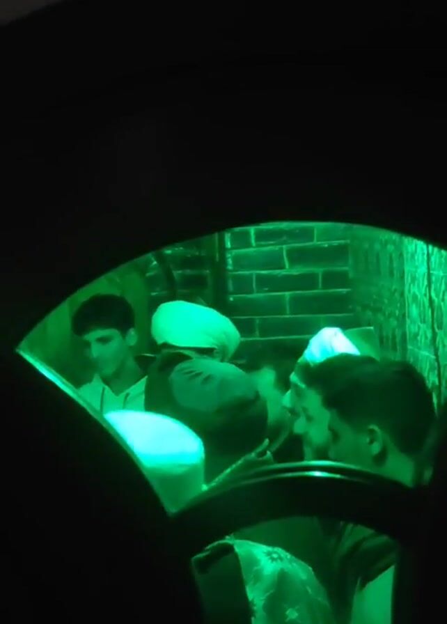 The scene, illuminated by green light, shows a group of about six men. One man lies in what appears to be a car seat with a white pillow behind his head. At least three other men, all wearing white caps, are leaning over him, engaged in a seemingly focused activity. The background includes a brick wall. The scene is framed within what could be a viewing device or window. There are occasional flashes of brighter light, likely due to the camera's automatic adjustment to the low light conditions.