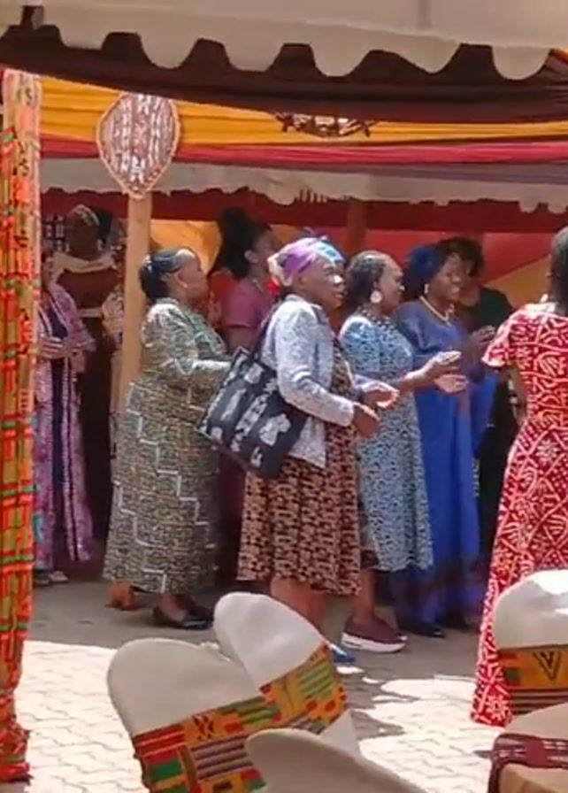 group of people gathered under a tent. The tent is decorated with colorful fabrics and has tables and chairs with colorful patterns. A man in a red shirt is taking photos with a camera. The people are dressed in a variety of colorful clothing. Some people are standing in line, others are talking, and some are taking photos with their phones.