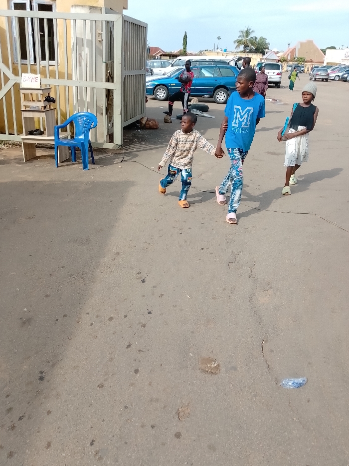 This image depicts an outdoor scene in the city of Bukuru, Nigeria, featuring three children walking from left to right across a paved surface, with various structures and vehicles in the background. In the foreground and midground, three children are observed. The leftmost is a young boy, wearing a patterned long-sleeved shirt, blue jeans with white patterns, and light brown open-toed sandals. He holds the right hand of an older boy to his right. This second boy wears a blue t-shirt with a white "M" logo, patterned light-colored jeans, and light pink open-toed sandals. To his right, a girl walks, dressed in a dark sleeveless top, a white patterned skirt, and light green open-toed sandals; she carries a blue rectangular object in her right hand. All three children appear to be looking towards their left, out of frame. The ground is a grey paved surface, consistent with asphalt or concrete, exhibiting cracks and various dark stains or debris. A crumpled blue plastic bottle lies on the ground in the lower right portion of the frame. To the left, a light yellow building is partially visible, featuring multiple windows. A tall, grey metal gate is open, positioned in front of this building. Adjacent to the gate, a blue plastic chair rests beside a small, two-tiered wooden stand with the letters "BY ME" (or "BUY ME" with partial obstruction) written on it. In the background, beyond the children and to the right, several vehicles are parked. A prominent blue station wagon is visible, behind which a person in a red and black patterned shirt stands, leaning against it. Further back, more vehicles and individuals are present, including a person in a green outfit. Distant buildings, one with a conical roof, and sparse foliage are discernible under a bright, overcast or slightly hazy sky. Shadows are visible on the ground, indicating a light source from the right.