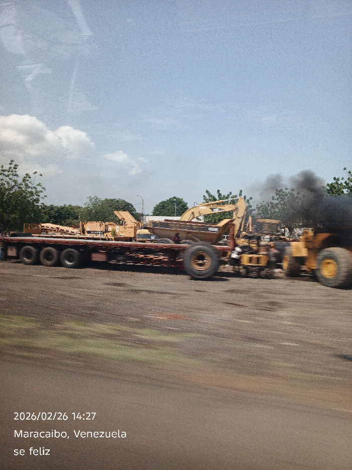 The image, dated 2026/02/26 at 14:27, depicts a scene in San Francisco, Venezuela. The photograph is captured from a moving perspective, evidenced by the motion blur across the foreground and lower midground. The environment is characterized by a bright blue sky with scattered white cumulus clouds, indicating clear daytime conditions. The ground in the midground and foreground is unpaved, appearing as reddish-brown earth with darker patches. In the midground, a dark-colored, multi-axle flatbed trailer is prominently positioned, loaded with several pieces of yellow heavy construction equipment. These include what appear to be disassembled components, an excavator arm with a bucket, and other machinery, with some visible "CAT" branding. To the right of the trailer, on the ground, a large yellow wheel loader or possibly a heavy-duty dump truck is present, actively emitting a dense, dark plume of black smoke from its right side, suggesting an ongoing combustion event or malfunction. A smaller, blurred yellow machine is situated between the trailer and the smoking vehicle. The background consists of green trees and foliage, interspersed with a utility pole. No individuals are visible within the scene. The primary observed action is the emission of black smoke from the heavy machinery.
