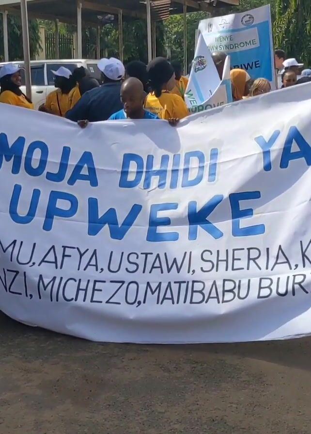 group of people participating in a march or demonstration. They are carrying a large white banner with blue text written in what appears to be Swahili. The text reads "PAMOJA DHIDI YA UPWEKE" followed by a list including "ELIMU, AFYA, USTAWI, SHERIA, KAZI, ULINZI, MICHEZO, MATIBABU BURE". Many participants are wearing yellow shirts. There are also smaller signs with additional text. The event appears to be taking place on a paved road or street, possibly near a building or park. A few vehicles are visible in the background, along with trees and other greenery. The weather looks sunny.
