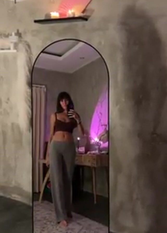 A woman is taking a mirror selfie. She is standing barefoot on a patterned rug in what looks like a living room or bedroom. She's wearing a dark brown sports bra and loose gray pants. She's holding a phone up in one hand and looking at herself in the mirror. The mirror is large and arched, with a black frame. Behind her, you can see a desk with various items, illuminated by a purplish light. On the wall above the mirror are two shelves; one has candles and a pink fan. The wall is textured with a gray, concrete-like finish. Upbeat music is playing in the background.