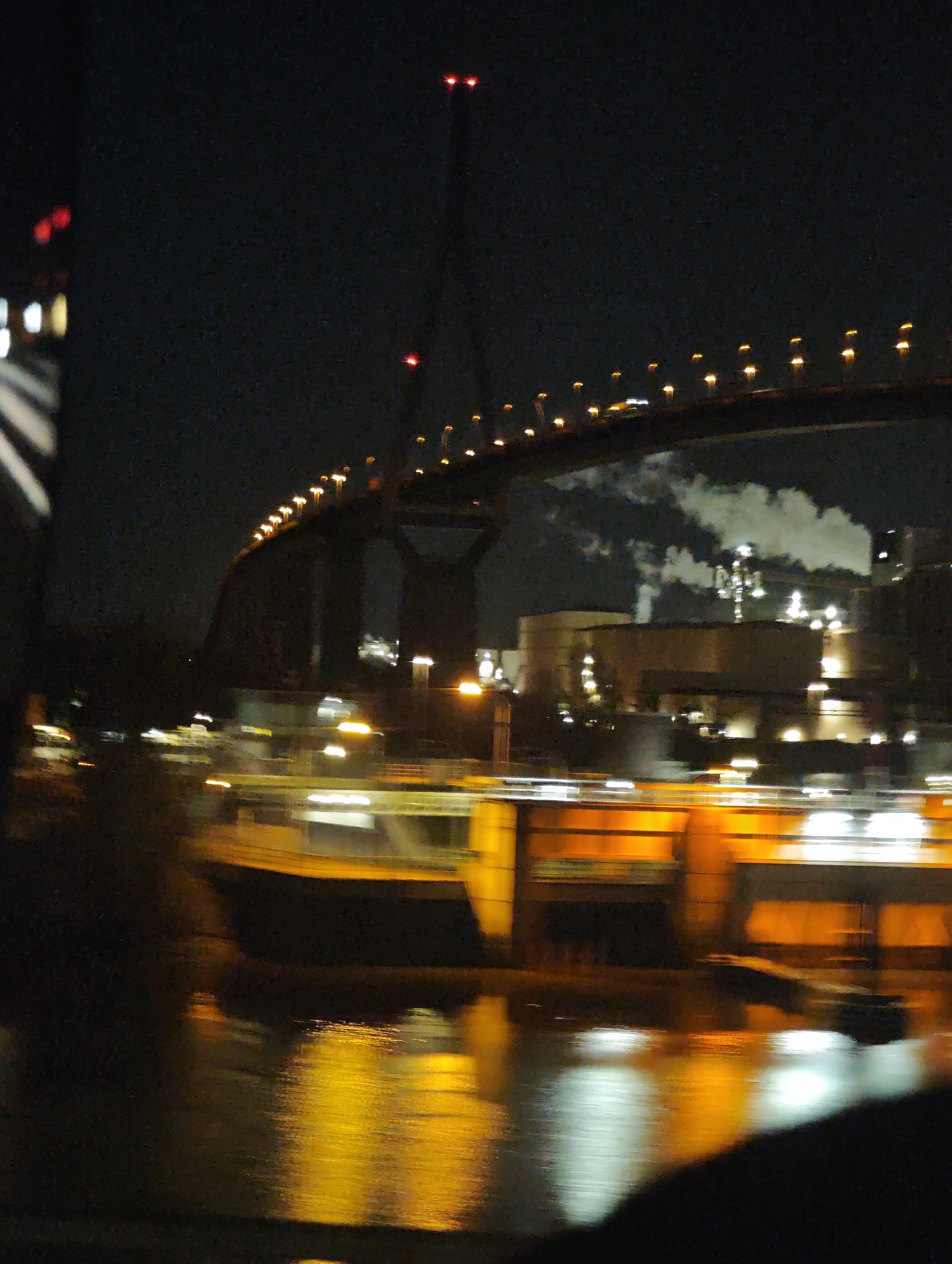 The image depicts a nighttime industrial waterfront scene in Hamburg, Germany. A large, multi-span bridge, likely the Köhlbrandbrücke, dominates the upper middle, its deck illuminated by numerous golden-yellow lights. Two distinct red obstruction lights are visible atop a bridge pylon or tower on the right side. Below the bridge, a body of water reflects shimmering streaks of yellow and white light. A large, dark-hulled vessel, possibly a cargo barge or ship, is positioned on the water in the mid-ground, featuring significant sections illuminated with bright orange and yellow light. On the far bank, beneath and behind the bridge, an industrial complex is active, emitting a prominent plume of white smoke or steam that rises into the dark sky, illuminated by facility lights. The buildings themselves are indistinct but show numerous point sources of white and yellow light. The foreground exhibits a dark, curved obstruction in the lower right, suggesting a view from within a vehicle or behind a structural element. The entire scene is characterized by motion blur and noise consistent with low-light photography.