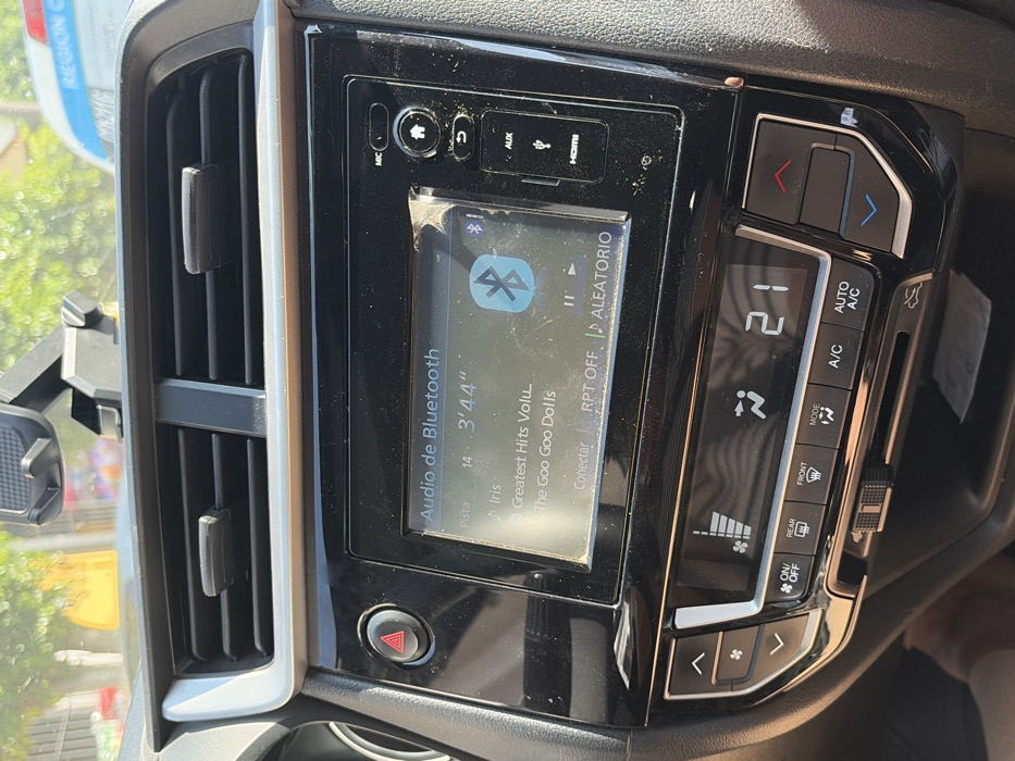 car dashboard with an infotainment system displaying Bluetooth audio playing the song "Iris" by The Goo Goo Dolls, with a runtime of 3 minutes and 44 seconds