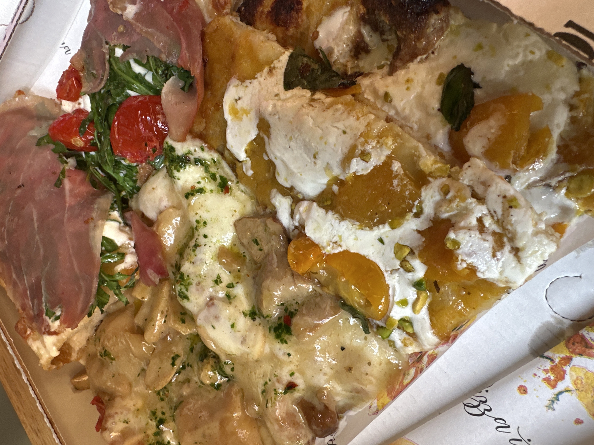 The image presents a close-up, overhead view of multiple slices of assorted pizza contained within a white cardboard takeaway box. The pizza is divided into distinct sections, each with different toppings. One section features slices topped with thin slices of prosciutto, fresh arugula, halved roasted cherry tomatoes, and visible white cheese. An adjacent section displays slices covered in a creamy, pale yellow sauce, sliced mushrooms, melted white cheese, and garnished with chopped green herbs and scattered red pepper flakes. A third section showcases slices topped with a generous quantity of white creamy cheese, bright orange fruit segments (consistent with apricots or peaches), chopped green pistachios, and scattered green basil leaves. The pizza crust varies in thickness and exhibits some charring, particularly in the lower right portion. A section of the white cardboard box, possibly a wrapper or insert, is visible on the left, displaying stylized black script that reads "Bravi" and a colorful, abstract design in yellow, orange, and red tones. Based on the visible text "Bravi" on the packaging, the pizza originates from a pizzeria in Rome, Italy.