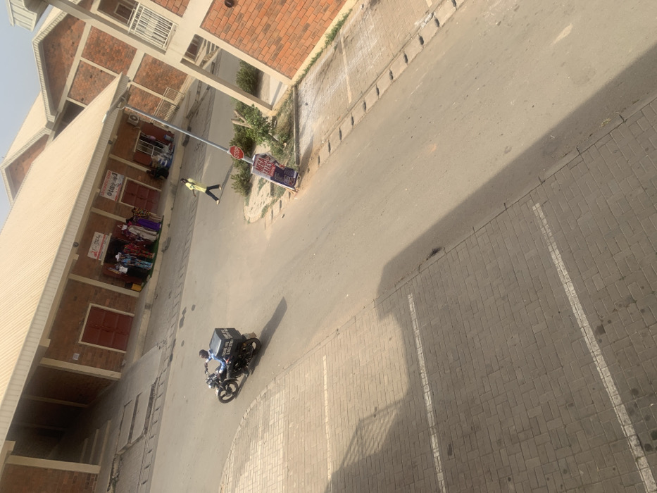 The image depicts an urban commercial area in Abuja, Nigeria, under daylight conditions. A dark-colored motorcycle with a black "SAME DAY LOGISTICS" delivery box attached to its rear is in motion on an asphalt road, heading from left to right. The rider is wearing a light-colored shirt. Further down the road, a solitary individual in a light-colored top and dark trousers walks from right to left across the asphalt. In the background, a two-story building with reddish-brown brick walls and a light-colored roof features multiple storefronts at ground level. One storefront displays colorful garments, and a sign partially visible reads "Curv." Other figures, possibly mannequins or individuals, are visible near the storefronts. To the right, another similar brick building is partially visible, featuring a balcony. A tall, silver-colored pole stands on a small patch of ground between the road and the background building. Attached to this pole are a red hexagonal "STOP" sign and a tilted banner advertising "MEGA SALES." The foreground features an interlocking brick pavement area with white demarcation lines, suggesting a parking or pedestrian zone. Strong sunlight casts distinct shadows across the scene.