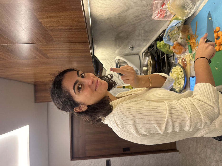 The image depicts a female individual in a modern kitchen setting, located in Aldoar, Foz do Douro e Nevogilde, Portugal. The subject has dark, wavy hair and is wearing a cream-colored, ribbed long-sleeved top and a gold-colored bracelet on her left wrist. She is smiling and looking directly at the camera. Her right hand is raised, with the middle finger extended upward, displaying a dark mark on its fingertip. Her left hand is holding a knife, actively slicing orange carrots on a green cutting board. The kitchen features white marble countertops and backsplash, dark wooden overhead cabinets, and a stainless steel range hood with integrated lighting. A gas stovetop is visible, with a frying pan containing food over a lit burner. Other items on the countertop include a white bowl with diced light-colored produce, a green bottle, a red and white packet of "QUEIJO FLAMENGO RALADO," and clear plastic bags containing food items such as broccoli. A smartphone is also present on the counter. A white kitchen appliance is situated behind the stovetop. In the background, a dark wooden door is visible against light-colored walls, and recessed lighting is present in the ceiling.