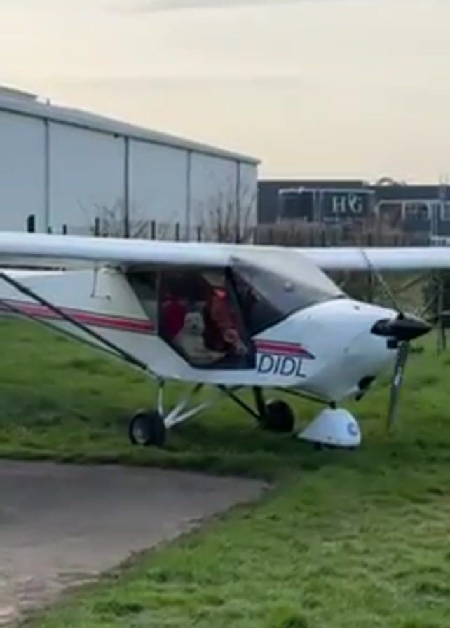 A small, white propeller airplane with the registration "DIDL" is parked on a patch of green grass next to a paved path. The propeller is spinning, and there appears to be a dog sitting in the cockpit. Behind the plane are large, industrial-looking buildings under a pale sky. Some bare trees are visible.