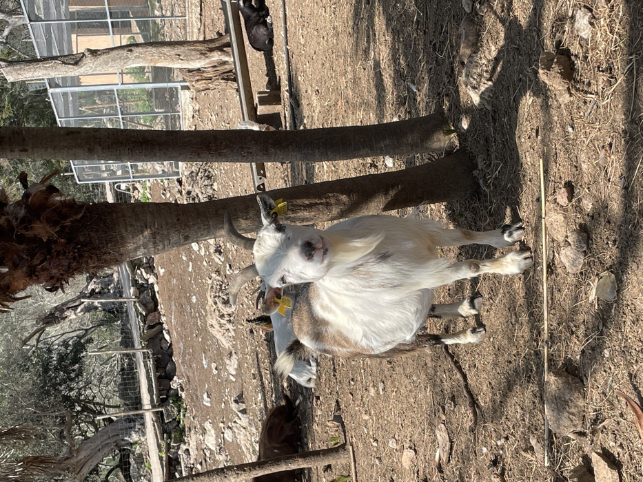 The image depicts an outdoor animal enclosure located in Bunyola, Spain, under bright daylight conditions. A single goat, predominantly white with brown patches on its legs and body, stands centrally in the foreground, facing the viewer. It possesses horns, a white goatee, and yellow identification tags visible in both ears. The ground is dry, appearing dusty and stony, with scattered organic debris. To the left and slightly behind the central goat, a partially obscured brown goat and a reclining white goat are visible, with a small dark bird behind the latter. Multiple tree trunks, including one thick and fibrous, and another thinner, cast shadows across the scene. The background on the left features a raised rocky slope with mature, gnarled trees and a wire fence atop a stone wall. On the right, large wire mesh enclosures with internal wooden structures are present, and a dark-colored animal lies near a horizontal wooden beam.