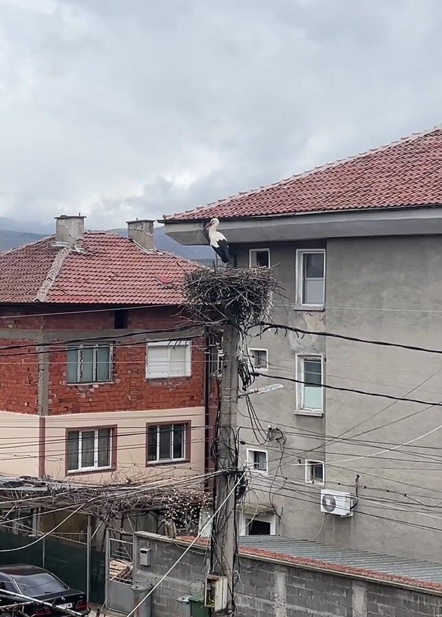 A white stork stands on a large nest atop a utility pole in a residential area. The nest is constructed from sticks and branches. Buildings with red-tiled roofs stand in the background, along with a cloudy sky and a distant mountain. Power lines run along the pole and across the scene. A car is parked in front of a brick building to the left. A short brick wall runs along the right side of the frame. The overall scene is muted in color, due to the overcast sky.